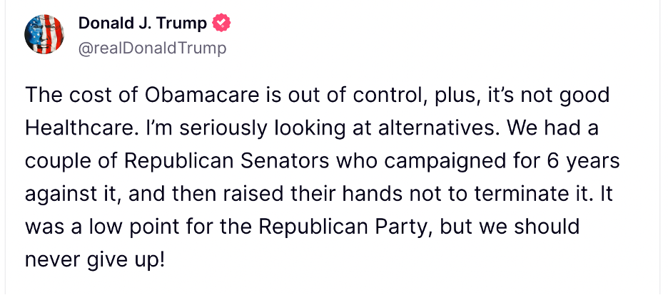 Last fall, Trump mused on Truth Social that if elected he would like to resurrect the failed effort during his presidency to repeal the Affordable Care Act (or “Obamacare”):